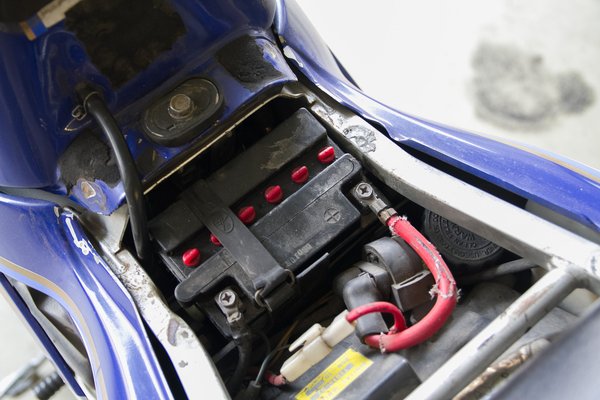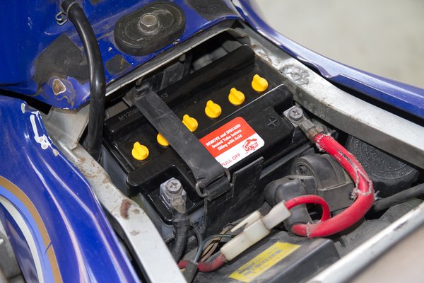 A javasolt félórás pihentetés alatt nekiláttam kikapni a régi akkut. Az FZR-nél csak az ülést kell lepattintani, és már látható is. Egy aranyos gumipánt tartja a helyén, ami úgy néz ki, mint a csehszlovák sílécrögzítők, csak Yamaha embléma van rajta. A pólusokhoz általában tízes hatlapfejű, kereszthornyú csavarok rögzítik a két kábelt. Először a negatívat érdemes leszedni, így elkerülhetjük a zárlatot. Ha nagyon meg vannak húzva a csavarok, jobb dugókulcsot használni ahelyett, hogy csavarhúzóval erőlködjünk.