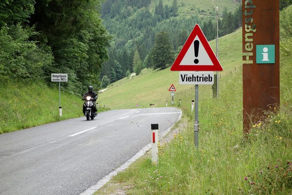 A túra végére iszonyatosan szerencsésnek éreztem magam a Burgmannel, mert bár nem olyan sportos, mint a Beverly, nem olyan könnyű, kezes és éhezőművész, mint a PCX 150, de nem szívesen cseréltem volna motort senkivel. Annyira kényelmes volt, kézre állt rajta minden, hogy volt olyan lassú szakasz, ahol az egyik kis kesztyűtartóból kibányásztam a csokimat, és menet közben majszoltam, közben a fülhallgatómból valami kellemes zene szólt, jobbra tehéncsordák, balra őzek, elől hegyek, hátul völgyek. Tényleg olyan volt, mint egy guruló nappali, kilátással az Alpokra. Méghozzá egy igen gazdaságosan fenntartható lakás nappalija, mert a hegyi szakaszokon bőven 3,5 liter alatt fogyasztott, volt, hogy épp csak három liter felett.