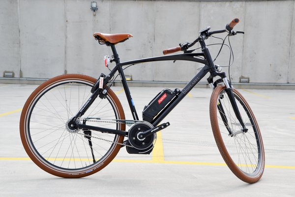 Szerencsénk volt, hogy a Smart és a Rise und Müller blueLABEL egyszerre érkezett a szerkesztőségbe, így közvetlenül össze tudtuk őket hasonlítani. A német gép maga a retro, a Brooks bőrnyereggel, és a steppelt markolatokkal még engem is megvettek, pedig irtózom az erőltetett múltidézéstől. Ez a szerkezet sokkal jobban hasonlít arra, amilyennek megszoktunk egy biciklit, kicsit idegenül is mutat a középcsapágy alá szerelt motor. Az akku nem képez egységet a vázzal, mint a Smartnál, viszont a felsőcső-homlokcső becsatlakozásának kialakítása kárpótol: igazából semmi különös, de annyira szépen nyílik ipszilonná a cső, hogy az már művészet.