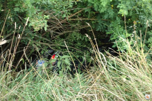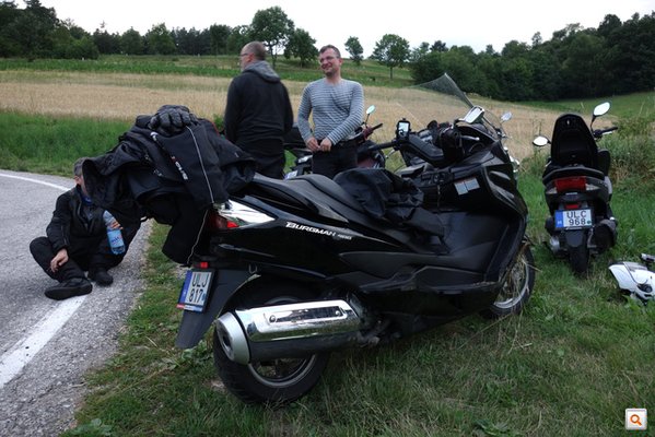 Hogy mennyire nem volt tempó, azt az bizonyítja a legjobban, hogy a beígért felhőszakadás ellen felhúzott esőruhámon egyetlen szakadás nem esett, igazából csak koszos lett. De a Burgmanben volt annyi lendület, hogy bezuhanjon a két méter mélyen zöldellő csipkebokorba. És milyen jó, hogy ez a szúrós, de sűrű bokor ott volt. Pillanatokon belül megérkeztek ugyanis a yarisos srácok, akik először elmondták, hogy egyikük pont itt esett be százzal egy Balenóval a másik bokorba, és tök egyszerűen ki lehet jönni a völgyből, majd segítettek kirángatni a motort. Mondjuk Gergő nélkül ez sem ment volna könnyen, de ő őserőből megoldotta a dolgokat, pillanatok alatt urává vált a helyzetnek. Felvett minden védőfelszerelést, hogy ne karistolják szét a tüskék, majd eltűnt az ágak közt. Legközelebb már azt láttam, hogy két lökéssel helyére igazítja a már kiszabadított Burgman kormányszarvát (ezt Dani előtte megpróbálta, de csak a homlokán sikerült kidagasztania az ereket, a kormány nem mozdult), majd Dani a motoron ülve, hátulról Gergő és Lacus által támogatva, a méteres fűben kioffroadozott az aszfaltra.