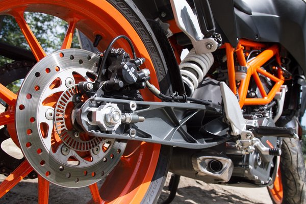 Amit 2014-re megtanult a motorkerékpár-ipar, azt mind belesűrítette a KTM. Fejre állított első teleszkóp, központi hátsó rugós tag alu lengővillával, méretes féktárcsák elöl-hátul, és még millió trükk, amitől annyira élvezetes tud lenni egy modern motor. Hiába gyártják Indiában, a kis Duke-ban benne van a KTM tudása, ezt érezni. Minden, ami történik rajta, szándékosan olyan.
