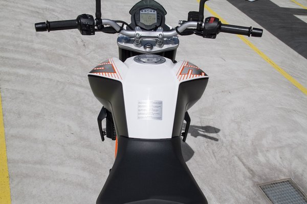 Persze, én is szilárdan vallom, hogy erőből sosincs elég. A 390-esnél nem is panaszkodhatunk gyengeségre, elképesztő, amit ez a blokk tud. Méretes egyhengereshez méltóan két-háromezres fordulattól szépen elkezd dolgozni, de fent, ahol műfajtársai elkezdenek fulladni, ő kinyílik. Gondolom, azért is kezd el nyolcezernél villogni a váltásjelző, mert olyan elszántsággal forog bele a tízezerbe, hogy amíg meg nem szokjuk, sokszor beleütközünk a fordulatszám-korlátozó falába.