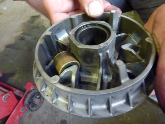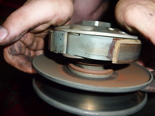 Nézzük, mi történik a váltóban ezután. A főtengelyen lévő tárcsapár külső, fixen rögzített tagja távoli végpontján van a belső oldalon lévő mozgó kuptárcsához. A szíj a lehető legkisebb sugarú körön halad köztük. Ha adunk egy kis gázt, a belső, kúpos tárcsa belsejében lévő variátorban megmozdulnak az addig nyugalmi állapotban lévő görgők. A görgők tömegét grammonként vagy tizedgrammonként határozzák meg a motor méretétől és teljesítményétől függően. Ez a CVT hangolhatóságának egyik eszköze. Az alábbi képen szétszerelt állapotban látható.