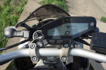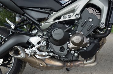 A kéthengeres MT-re egészen apró motorként emlékszem, szinte nem is felülünk rá, hanem magunk alá rántjuk. Érdekes, hogy a műszaki adatok szerint alig pár centi különbség van köztük, mégis jóval felnőttesebb a 09-es, komoly, nagy motor benyomását kelti - ez már nem játék. A háromhengeres is nyersen, durván jár alapjáraton, az első pillanattól érezteti, itt nincs finomkodás, mindjárt csattan a pofon.