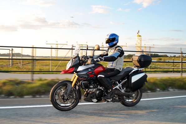 Már a motor átvételekor telipakoltam a három gyári koffert, plusz a hátsó ülésre került egy hengertáska. A délutáni csúcsforgalomban, az autók közt araszolva kifejezetten billegősnek éreztem a motort. Kiérve az autópályára az instabil érzés csak fokozódott – 150-es tempó környékén, erős oldalszél mellett a kamionokat előzgetve szinte folyamatosan kígyózott az eleje. Szerencsére a rugó-előfeszítés rendes túramotorhoz méltóan szerszám nélkül, kézzel állítható. A legkeményebb állástól néhányat visszatekerve a kóválygás megszűnt, és kanyarstabilitása és sokkal is jobb lett. Az egyik napi csillagtúra alkalmával, a csomagok nagy részétől megszabadulva már kiegyensúlyozottan viselkedett. Nagyon könnyen dönthető, a szűk visszafordítókban is pontosan irányítható. További pozitívum, hogy direkt kanyarban fékezve sem jellemző rá komolyabb felegyenesedési hajlam. A fékek erejét, adagolhatóságát és az ABS működését sem érheti kritika. A relatíve feszes hangolású első villa erős fékezéskor sem térdel le jobban a kelleténél.