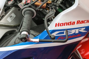 A kormánymarkolat feletti apró csavar tekerésével a versenyző szabadon állíthatja a fékkar pozícióját, ha az futam közben mégsem kényelmes, míg a kuplung oldalon érdekes kar türemkedett a kormány alatt, olyan, mint amit Doohan használt az ötszázas motoron, amikor képtelen volt lábbal fékezni. Nem tévedés, McGuinness motorján is alkalmazzák a módszert, de a hátsó fék segédkarja itt más funkcióval bír. Ha egy útegyenetlenség miatt teljes sebességnél egykerékre áll a motor, akkor a versenypozícióban kuporgó pilótának elég nehéz korrigálnia, így a fék finom érintésével megszüntetheti a jelenséget, és nyugodtan folytathatja útját háromszáz körüli tempóval.