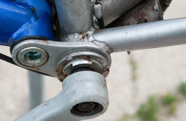 Itt el is értünk a lényeghez: mi indokolja, hogy a szemre egyszerűbb, kevésbé komolynak látszó bringa kétszer annyiba kerül? Elsőre érdemes megnézni az Alpha vázát: a hegesztések igénytelenek, és ezzel még együtt lehet élni, de a váz aránytalanul nehéz. Nem mintha acélból ne lehetne könnyű és erős vázat építeni, de az gyakran többe kerül, mint egy minőségi alumínium vagy karbon szerkezet. Ráadásul ennek itt hátsó futóműve is van, ami több ponton elvérzik. Két-három centi rugóút semmire nem elég, csak arra jó, hogy feleslegesen elnyeli a pedálozásba fektetett erőt, ráadásul mivel nincs csillapítás, minden kirugózásnál hatalmasat kattan, elöl és hátul is. A rugóút szerencsére idővel nőni fog, igaz nem fel-le, hanem oldalra. A lengővilla forgáspontja csapágyakról hírből sem hallott, de még egy rézpersely sem fért bele, csupán egy műanyag fogatban fordul el, amely aztán kikopik, és úgy kanyarodhatunk, mint a csuklós busz. Amikor szétszedtük, gyanús folyadék csöpögött belőle, de nem kell megijedni, nem kenőanyag, csak esővíz. Aki ezek után is azt hiszi, hogy a dolognak van létjogosultsága, az nézze csak meg, hol van középcsapágy: bizony, a lengővillán. Tehát minden rázkódást megkapnak a lábaink, csak akkor van valami halovány értelme a rugózásnak, amikor ülünk. Ha elkerülhetetlen, hogy áruházi bringát vegyünk, akkor legalább erről mondjunk le, a merev váz stabilabb és könnyebb.