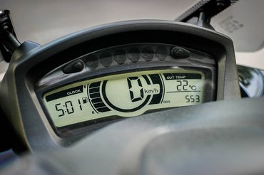 Jól látható a műszerfal, ami nyilván már digitális. Ez az, ahol szerintem az egértévének helye van, nem éppen az XV 950R-en. Annyira, hogy konkrétan meg kell jegyeznem: a Tricity műszeregysége szerintem tökéletes. Dizájnban, de főleg funkcionalitásban is tetszett. pedig kettőt találhatsz, mennyire szoktam izgulni a robogó műszeregységekre. Minden rajta van, ami kellhet, jól láthatóan, könnyen leolvashatóan: fogyasztás, hőmérő, időmérő, kilométerszámláló, középen nagyban a sebesség.