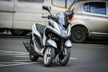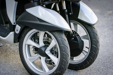 Három tárcsafék, elöl két 220 mm-es, azaz kerekenként egy tárcsás, hátul egy 230 mm-es és hogy tuti legyen, itt figyel az UBS kombinált fékrendszer is, amit egyébként nem tudtam, de az első fékezésnél észrevettem. Ez egy egyszerű, mechanikus jellegű kombifék, ami tökéletesen passzol ide, abszolút hülyebiztossá téve a fékezést, így még a rutinos robogósokat sem tudná megkavarni az, ha a hátsó kerék blokkolásával valami szokatlan művelne a Tricity.
