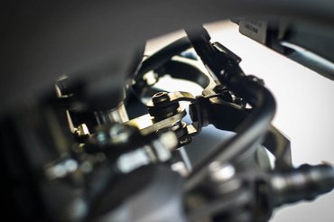 Csakhogy nem a kerék két oldalán oly módon, hogy a kerék a teleszkópszárak között helyezkedik el, hanem a kerekek belső oldalán van mindkettő, egymással összecsavarozva. Kicsit sufnituningnak tűnik elsőre, de a gyárban épp elég időt töltöttek a fejlesztéssel ahhoz, hogy meglegyen a bizalmunk.