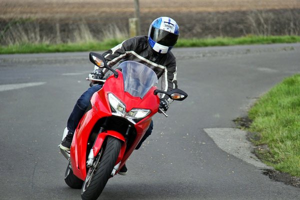 Az áthelyezett hűtők miatt a vízhőfok városban sem kúszik állandóan forráspont közelébe. Az, hogy ezáltal karcsúbb lett az oldalidom, már nem mindenkinek pozitívum: a lábak szélvédelme így valamelyest csökkent. Ettől függetlenül a VFR igazi terepe az országút. Mivel nem túl hegyes a futóműgeometria, és a súly sem kevés, atomstabilan fordul még az erősen nyomvályús kanyarokban is. Előzésnél sűrűn vissza kell váltani, de a hibátlan váltóval és vajpuha hidraulikus kuplunggal ez nem nyűg, hanem örömforrás. A művelet utáni jutalom pedig a V4-es fémes üvöltése. A plexi jóval nagyobb felületű és magasabb a sportmotorokon megszokottnál, ezért a hozzám hasonló lombrágóknak is csak 160 felett érdemes a tankra hasalni. A végsebesség valamivel 250 km/h alatt van.