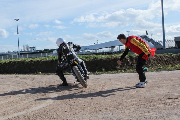 Mielőtt bárki motorra ülne, és vad vágyakkal nekirongyolna a pályának, kötelező elméleti oktatással indul a nap, az ébresztő kávé elszürcsölése, és a reggelire kínált briós elcsócsálását követően. Belli monitorra vetített képek segítségével vázolja a napi programot, beszél a flat track rejtelmeiről, valamint a helyes testtartásról. „Mivel a flat track semmihez sem hasonlítható, a gyakorlati oktatáson visszatérünk az alapokhoz, a nulláról kezdünk mindent. A nap végére újraépítjük a motorosok egyéni határait. Aki hozzánk jön, annak elég, ha már képes egyedül elindulni és váltani, a többire úgysem lesz szüksége. Elsősorban a megfelelő vezetési pozíciót kell mindenkinek elsajátítania, ez teljes mértékben eltér attól, ahogy az utcán motorozunk.”