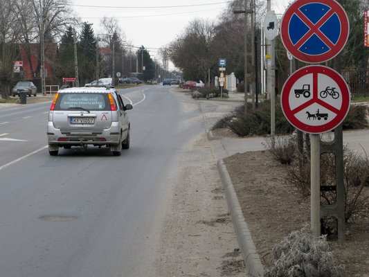 A 2-es főút átvezető szakaszán, a Pesti úton, mintha véletlenszerűen potyogtatott volna el tilalomtáblákat a Magyar Közút Zrt. Pest megyei Forgalomtechnikai Osztálya. Lehetetlen bármiféle logikát felfedezni. Nézzük csak: délről északra haladva rögtön a helységtábla után kitiltó tábla fogad (Vác felől nem!), de hatályát rögtön fel is oldja a néhány lépésnyire betorkolló Pázmány Péter utca. Még négyszer ismétlődik a kabaré a település végéig. Fordított irányban négy kurta szakaszon van tiltás, amúgy a főút túlnyomó részén szabad kerekezni. Netán keskenyebb, vagy más szempontból eltérő az út a kérdéses helyeken? Nem, pontosan ugyanolyan, mint a közel öt kilométernyi hosszán bárhol.
