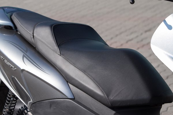 Az ülőhelyzet a szokásos kiskerekű robogós, én a 173 centimmel enyhén görnyedten ültem rajta, de a 77 centi magas ülésről lazán, teli talppal leért a lábam. A motor nem nehéz, 135 kiló, plusz cirka 8 kiló benzin (10,5 l), meg még vagy 2,5 kiló egyéb folyadék, így sincs az egész másfél mázsa, ráadásul alacsony súlyponttal. A plexi a nagyjából nyakig védi meg az embert a széltől.