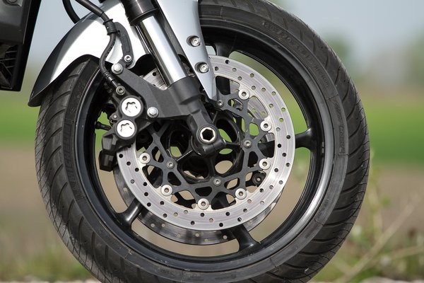Az első fék nagyon pontos, jól adagolható, öröm hozzányúlni. Az egyre rövidebb fékezésekben a villa is partner, nem bólint nagyot, szépen csillapít, még a pánikzóna határát közelítve sem lesz ideges a motor, nincs kígyózás vagy tekeredés. A hátsó fék már nem ennyire szenzációs, tompának érződik, majd aztán hirtelen el kezd sikítani a 190-es hátsó gumi – áhá, ezek szerint nincs ABS, született meg a felismerés. Valószínűleg a rövid tengelytáv miatt van így, gyorsan hamar átkerül a súlypont az első kerékre. Utassal más lenne a helyzet, de hát a hátsó ülés vicc.