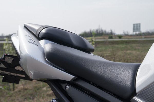 Klasszikus sportmotoros darab, két tenyérnyi, kemény felület, humanoidot csak rövid távon szállítsunk rajta, de a nyeregtáskának vagy a hengerzsáknak ideális, ha túrázni indulnánk. A vezetőülés viszont csak ránézésre sportmotorról való. Eleve vastagabb a szivacs, de ennél fontosabb, hogy a sportgépeken a tank-ülés sokkal keskenyebb, ez viszont jobban alátámasztja a combot. Ha nem kell kanyaronként más-más irányba lelógni, ez sokkal jobb, már közepes úton is hálás érte a segg.