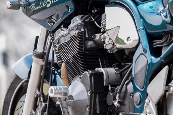 Indulás után a nyomatéké a főszerep, az 1100-as GSX-R-től eredeztetett lég-olajos négyhengeres hosszú időn keresztül jól szolgált a Suzukinál, végül az emissziós előírások nyírták ki. 98 lóerő 1200 köbcentiből nem a világ teteje, inkább szépen megy, mint jól. A gázt csodálatosan simán veszi, ezen túl ha valaki rinyálásba kezd az injektoros motorok gázreakciója miatt, tudni fogom, hogy ez lehetett neki a referencia. A nulla gáz és a nagyon-nagyon kis gáz közötti átmentet tökéletes, aztán pedig rendesen odacsavarva azért meglódul, de azt is olyan selymesen teszi, mintha egy kanáritollal bélelt párnával törölnének képen. Nulla idegesség, aztán hopp, máris 180-at mutat az óra. Attila mesélte, hogy amikor hozzá került, nehezen indult, de a karburátorok kipucolása és beállítása csodát tett, azóta pöccre indul és stabil az alapjárat. Mint egy modern motor, pedig részleteiben azért ez már sokkal inkább a múlt, mintsem a jövő.