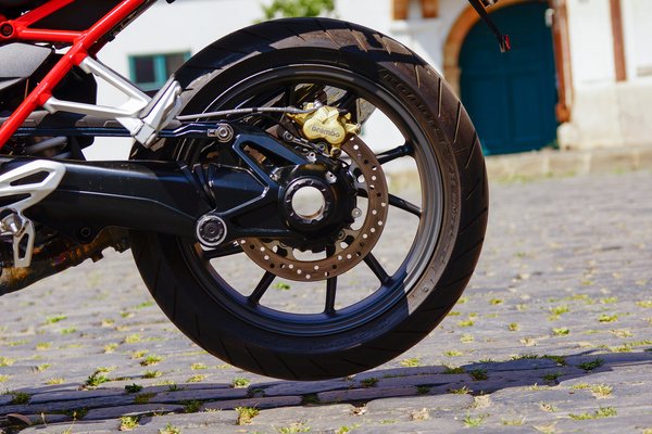 Az egyes érezhetően rövidebb, mint az RT-n. Pont így szeretem. A második naptól nem is kuplungoltam többé, mert a váltóasszisztens fel- és visszaváltáskor is tökéletesen teszi a dolgát: gázfröccsöt ad, mielőtt behúzza a következő fokozatot, így majdnem mindig észrevétlen a kapcsolás. Majdnem, mert felfelé ránt néha egy kicsit, de ezt is meg lehet szokni. Ismerkedés után már tényleg csak azért pedáloztam, hogy újra és újra elöjöjjön a kapcsolásokat kísérő pöfögés. A motorhoz csúszókuplung is tartozik, ezért pillanatnyi kerékblokkolást csak durva visszaváltással és ráfékezéssel idézhetünk elő.