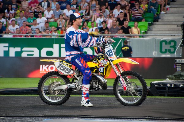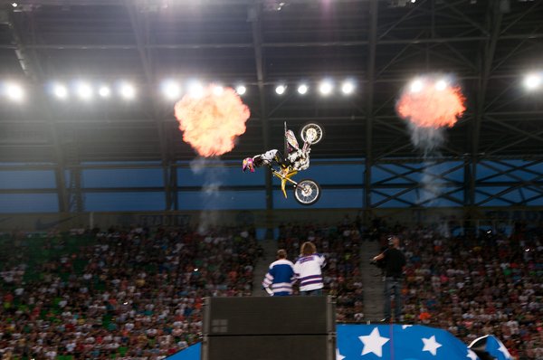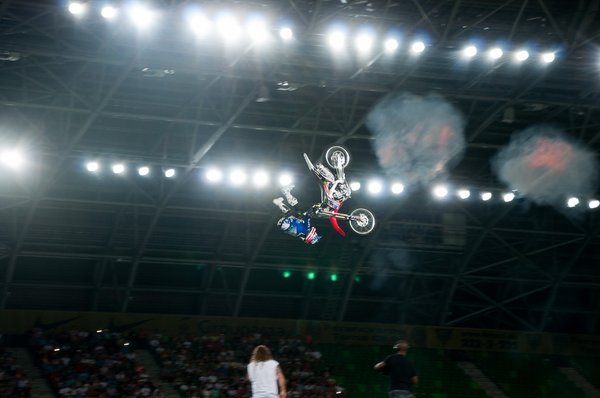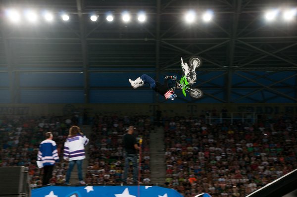 Maga a műsor dramaturgiailag két elemre bontható: az egyik a motoros megőrülés, itt a freestyle motocross legnagyobb nevei tépik a gázt, a másik pedig az ugrassunk mindennel, aminek kereke van szekció. Ez a két csapat uralta az aréna légterét, emészthetőre szervezett bontásban, félelmetesen pörgősen, az unalmat kilométerekről elkerülve. Bemelegítésnek whip-eztek egy jót az FMX-esek, ilyenkor ostorcsapás-szerűen – whip, vagyis ostor – keresztbe forgatják a motort a levegőben. A kilencven fokos szög volt az alap, és már ez is elég valószínűtlen látvány, de egyesek simán elhúzták annyira, hogy azt hittem, rükvercben érkeznek majd. Egyesével sem kis dolog, de ritkán hagytak három méternél többet két motoros között. Kedves gesztus volt a csapattól, hogy két magyar versenyzőt, Németh Kornélt, és Hujber Pétert is szerepeltették, igaz nem sokat kerültek a porondra.