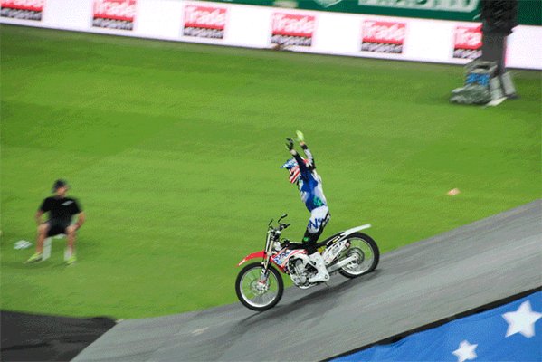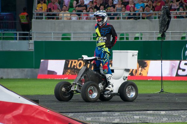 Úgy két hónapja írtunk Josh Sheehanről, aki azóta a világon elsőként összehozta a tripla hátraszaltót motorral. Ezen az estén is eljött, bár az ominózus trükköt nem mutatta be. Ez persze érthető, hiszen egy tizenegy méter magas eldobóra volt hozzá szüksége, és közel jóval húsz méter fölé repült a három fordulat közben. Ezt az apparátust lehetetlen lett volna a stadionban összehozni, de így sem ment rosszul.