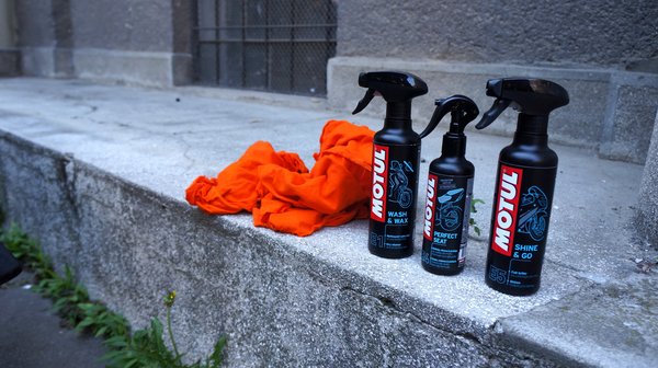 Úgyhogy felpattintottam egy szombat délelőtt a Motul-doboz tetejét és szétnéztem benne. Nagyjából minden benne volt, ami folyik, és amin a cég logója van, valamint szükségünk lehet rá. Így természetesen a három flakon is. A Wash&Wax nevű szárazmosó (kb. 2200 Ft), a Shine&Go (kb. 3000 Ft) nevű polírcucc és a Perfect Seat (kb. 3900 Ft) nevű impregnáló-folyadék. A továbbiakban hívjuk csak őket Dalton fivéreknek.