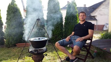 A supportunk pedig: Feri, a Séfünk. Fontos: a mi táborunknál lesz bográcsozás, zene, tánc. Feri fogja vezetni a bográcsozást. Amiért előléptettük, annak egy oka van, mert már kóstoltuk a főztjét. Ő a motorozást annyira nem éli egyébként, de az autózást annál inkább. Amíg a többiek bohóckodnak a pályán, mi főzünk, táncolunk, énekelünk. Szóval, jól érezzük magunkat, és közben a robogózásban kifáradt csapattársainkat fogjuk szórakoztatni.