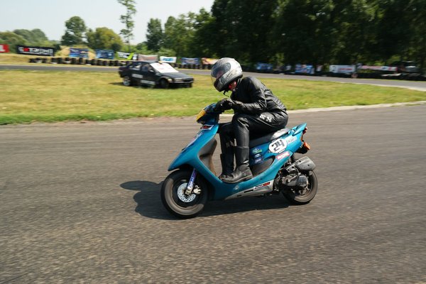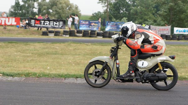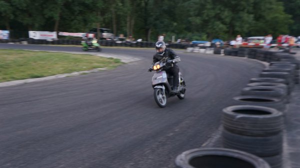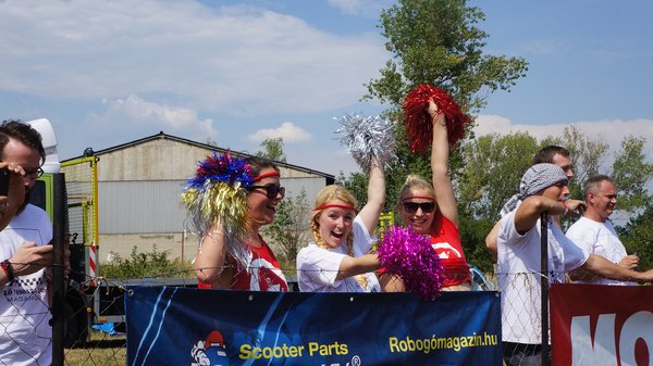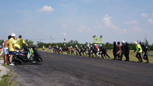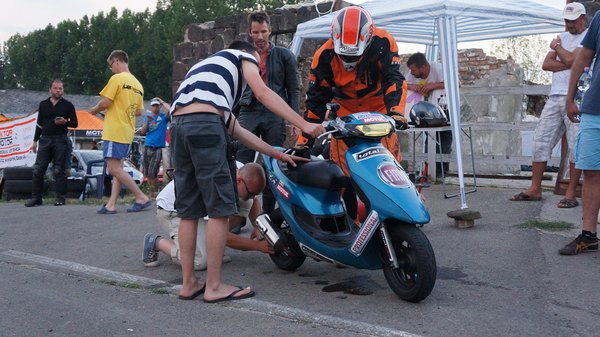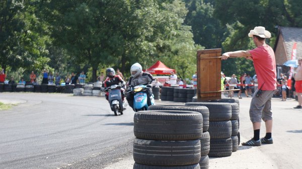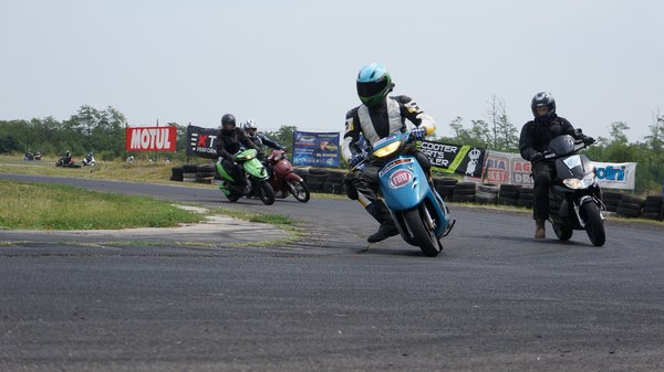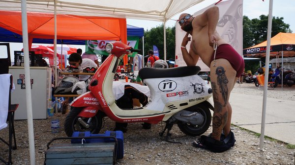 Javarészt japán robogók csatáznak, de vannak szemet gyönyörködtető kivételek is. A boxutcában sétálva akadok a jó kedélyű srácokra, akik teljes nyugalomban várják a kezdést. Közismert, ha egy gép olasz, legyen autó, vagy épp robogó, heves érzelmeket vált ki az arra fogékonyakból. Erre itt a legjobb bizonyíték a szemem előtt: emberünk Vespa nyaklánccal koronázza a Vespa tetoválást a combján. Természetesen Vespa ET2 robogón ül, és mindenkit le akar nyomni vele. Két hangos nevetés között sok szerencsét kívánok nekik és megyek a következő sátorhoz. A hangulat pedig csak egyre jobb lesz. A legjobb köridő 1 perc 14 másodperc, a leggyengébb közel 1 perc 50. Van különbség, de korán örülnek a sprinterek, ha nem bírják a hosszú távot.