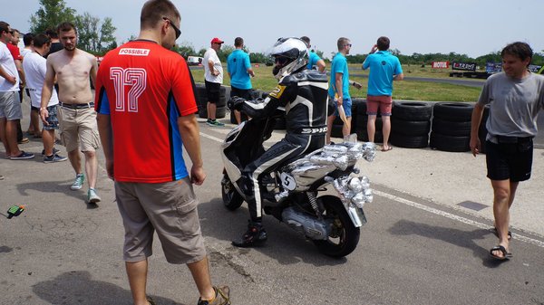 Akinek más elektromos gondjai vannak, spórol az akkumulátorral vagy csereakkut használ és a csapat teherautójáról tölti azt a darabot, ami éppen nincs a robogóban. Egy többmenetes fényszóróállítás után a Totalbike Monkeys elszenvedte mai második esését, ezért kevéssel ezelőtt hosszabban szerelt a csapat a bokszban. Göbölyös Zsolt Motordoktor bukott egyet, a Dión elhajlott a jobb oldali fékkar, és a berúgókar szorulni kezdett, ami kicsit zavaros, hiszen az a robogó bal oldalán található. A karburátor túlfolyt, így a motor indíthatatlanná vált egy időre. Most Pista vezet, mert természetesen nem esett ki a Totalbike.