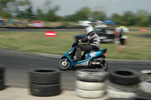 A másik sorozatban a Robogómagazin.hu versenyzője egy Piaggio NRG Mc2-vel, egyenesen a gumifalnak csúszik. Ezek a kiváló sportemberek már nagyon spiccen mennek, de még nem fáradtak. Van, aki már túl van a középállvány leszerelésén, ugyanis ez ér le leghamarabb a kanyarban, és a szabályzat nem tiltja, hogy nélküle menjenek a versenyzők.