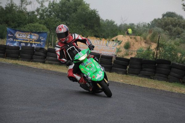 Dani: Amikor egyszerre huszonnégy pilóta rohan huszonnégy robogóhoz, majd egy pillanat múlva egyszerre lódulnak neki, az semmihez sem hasonlítható élmény annak is, aki csak a pálya széléről nézi a versenyt. A Le Visonta pontban három órakor elindult és nem is látszik megakadni az első körök után. Az már most látszik, hogy az 1 perc 13 körüli legjobb edzésidőt produkáló élmenő, a lecsupaszított Aprilia Scarabeóval pokoli nagyokat ver rá az 1 perc 25-30 körüli időkre képes, jellemzően kiskerekű japán robogókat hajtó közepére és arra az úrra, aki egy Malaguti Centróval közel egyötveneket ment.