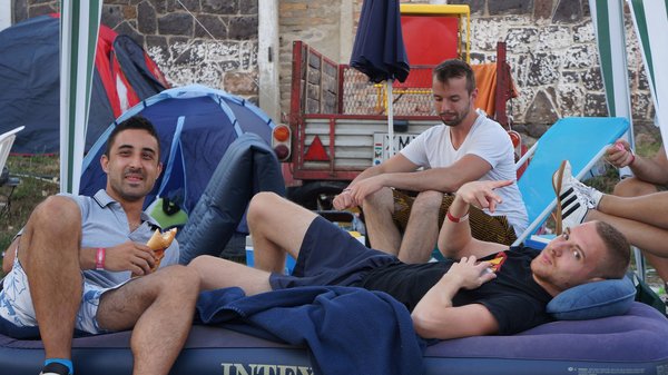 A szurkolótábor nagyrészt sátrakba és kocsikba húzódva töltődik a holnapi hajrára, de állandó a mozgás, hiszen csapatonként 3-4 fő biztos, hogy mindig ébren van. A büfé egy visszatérő találkozási pont lett, mint az éjszakai városunk szívcsakrája, adagolja a kávét.