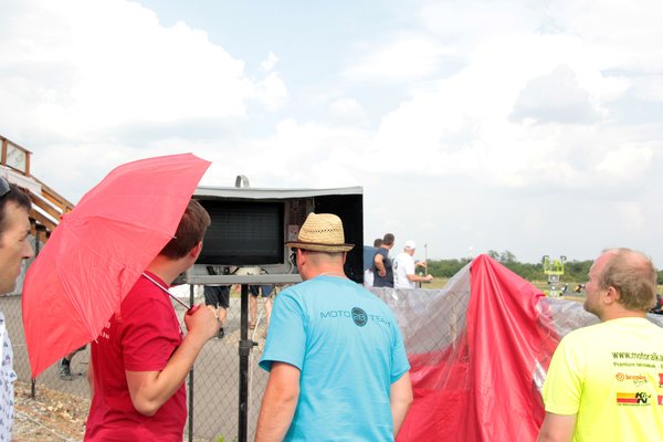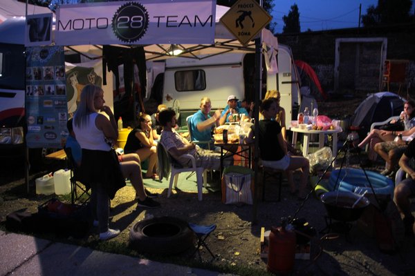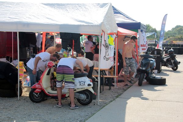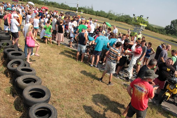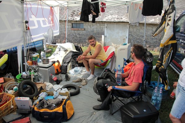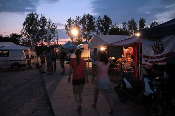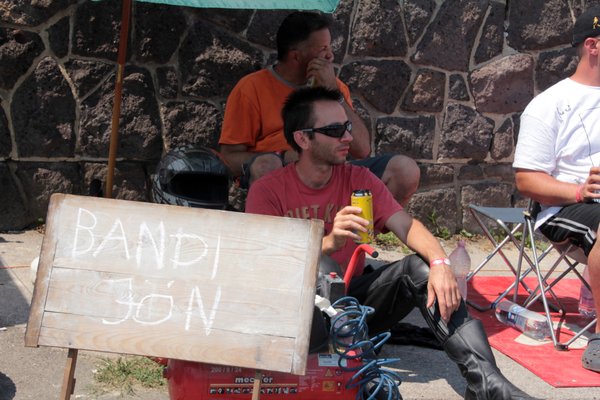 A Nap csak perzsel kegyetlenül, húzom magam után a vizes palackomat, az esőztető kapu alatt két aprócska kis gyerek – éppen járni tudnak csak – önfeledten tapicskol és nevetnek a szivárvány minden színét szóró vízcseppekre. Végignézek a paddockon, a girbegörbe sátrakon, a grilleken, a csapatzászlókon, a kávét főző csajokon, látom a friss látogatók arcán, hogy nem értik, miért ilyen leült minden és miért esik nehezére mindenkinek a beszéd. Szétszórt dolgok, vizes ballonok, kényelmetlen pózba merevedett alvó emberek és a háttérben a motorok szüntelen zümögése... tiszta Woodstock, gitárszóló helyett rezonátorok reszelésével.