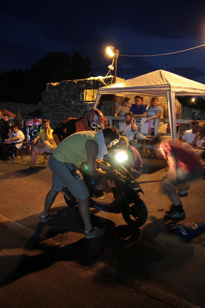 Jött Göbölyös doki, aki kipihenten érkezett és krosszmotoros múltját nem hazudtolta meg: azonnal jobban ment, mint mi hárman, pedig először ült a gépen, ráadásul ő már a koromsötétbe is belefutott és akkor derült ki, hogy a fényszóró mindenhová világít, csak az útra nem. Illetve de, csak nagyon közel, amivel semmire nem ment. Ki is kiáltott, hogy baj van vele, megkértük, hogy maradjon pár kört, amíg elrohanunk a szerszámokért. Így is lett, de rutintalanságunkra ráfaragtunk, hiszen nem állítottuk be még a verseny előtt a fényszórót, pedig semmibe nem telt volna.