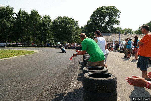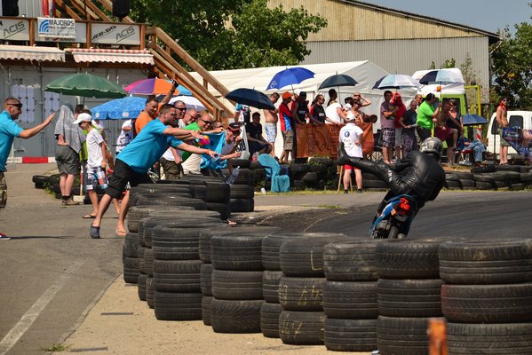 És persze elestem, mert hülye voltam. Voltak pedig figyelmeztető jelek, hiszen abban a kanyarban annyira magam alá toltam a motort balra, le, hogy kétszer-háromszor már belekarcolt a variátorház a betonba, de mindig visszajött szépen. Hát most nem és mielőtt bármit tehettem volna, már csúszott is ki a fűre, én meg térden utána. Szerencsére nem állt le, így gyorsan felkaptam, intettem a pályabírónak, hogy minden oké és mentem tovább. Először úgy gondoltam, hogy mákom van, hiszen alig öt másodperc esett ki, de a következő kanyar előtt már vertem a fejem a falba. Hiába nyúltam a hátsó fékkarhoz, az nem volt ott, letört. Időt kellett nyernem, hogy a srácok és Bandi, a pilóta/szerelő rá tudjon készülni. Felhajtottam a plexit, elhúztam előttük, miközben mutattam a kar hűlt helyét és üvöltöttem, hogy letört! letört!