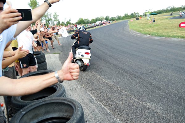 És a legnagyobb dolog számomra, hogy ezt mondták a hétpróbás profik is, nem csak a hétvégi kocaversenyzők. Ez pedig azt jelenti, hogy valamibe betaláltunk, de nagyon. Az, hogy a verseny vége felé ott álltunk nyolcan-tízen és torokszakadtából biztattuk a versenyzőinket, hogy menjenek még, az szinte felfoghatatlan. Egy 24 órás, ötven köbcentis robogóverseny végén ott álltam 36 évesen és izgultam, mint egy kisgyerek, ordítottam a kilencedik helyért és ha szétnéztem, akkor hirtelen csak ilyen embereket láttam magam körül. Tőlem sokkal idősebbeket, fiatalabbakat, megtelt velük a tér és kórusban biztattak most már mindenkit, ilyen hangulatot eddig csak Le Mans-ban éltem meg. Eufória, üdvrivalgás, nevető, boldog arcok és ha tehetném, akkor ezt a pár másodpercnyi videót vágnám az arcukba azoknak, akik az elején csak becsmérelni tudták és elmondták, hogy miért nem lehet megcsinálni és hogy úgysem bírják ki a robogók, meg majd megtudjuk, milyen ez.