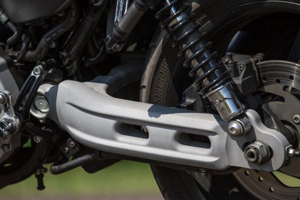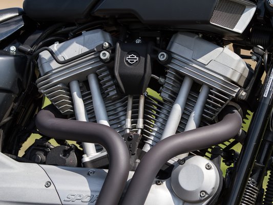 A lényeg mégsem ez, hanem a vezethetőség. Ennek érdekében hátra hozták a lábtartókat, de nem csak a chopper kivitelekhez képest, hanem a roadster 883-hoz képest is, ezzel egy nagyon jó, amolyan naked bike-os térdszöget értek el, amihez megtartották a széles, dirt track kormányt. Az üléspozíció tehát rendben van, így már rendesen lehet motorozni. A futómű is szokatlan, a Harley-nál ritka látvány a fordított első futómű, ahogyan a kimondottan ehhez a modellhez készült a vaskos alumínium lengővilla is, amivel a többi Sportster vékonyka acélszárait váltották ki. A dupla tárcsafék jelzi, hogy ezzel végre meg is lehet állni – oké, érezni a 260 kilót, de egy kiadós bambulásból ébredve sem vertem telibe az előttem satuzót.