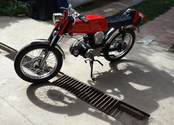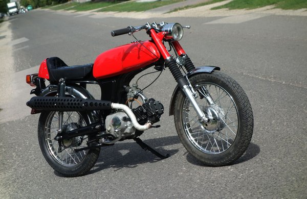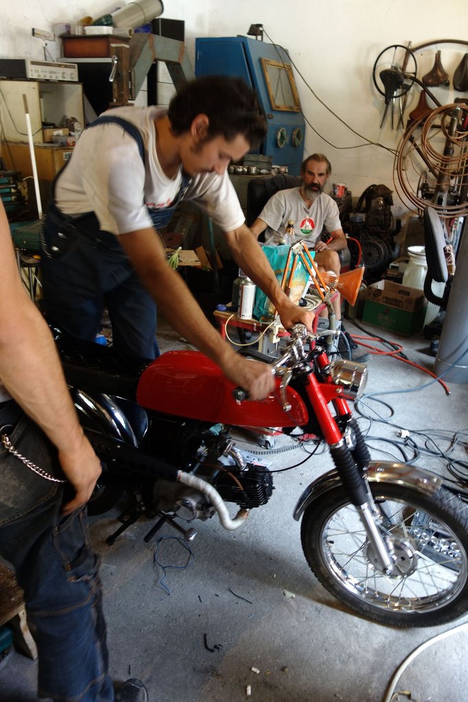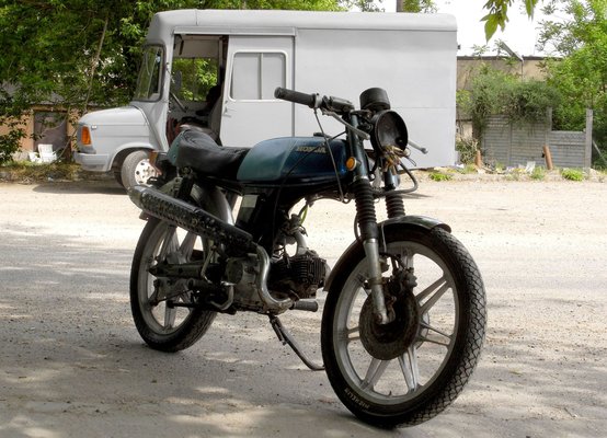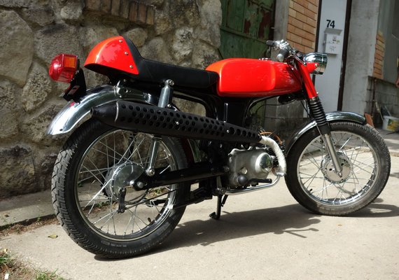 Azt hiszem, az enyém már az ötgangos, későbbi változat, bevallom, nemigen mentem vele, mert szinte lehetetlen volt – elöl és hátul egy-egy KTM-kismotorról való, aluküllős kerék volt benne, mindkettő lötyögött, a féknek köze nem volt a működéshez, fedelek hiányoztak, berúgókar hegesztve, festék rátaknyalva, elsőlámpa tákolva – egy förtelem volt. Pontosan nem is tudom, mit akartam vele, ha jól emlékszem, kereket akartam szerezni, féket berhelni, tudomisén.
