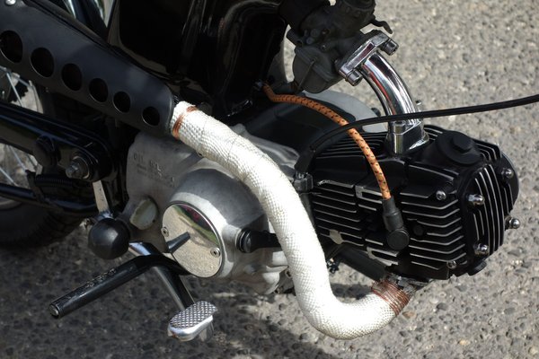 Szakál-védjegy a bandázsolás, a könyök itt is kapott belőle, s hogy a túl sok króm meg ne ölje a tiszta összképet, a kipufogódob fekete lett, s mivel felhúzott, ezért fekete lett rajta a Simson enduro-féle hővédő rács. Csinos. A kerekek is meglehetősen trükkösek: a ráf Babettáé, a küllők Simsonéi (Szakál fiának egyedi fűzésével), az agy Jawa Mustangról származik, de Szakál kipolírozta belőlük azt a szörnyű ronda, pöttyös mintát, amit talán az elégtelen felületmegmunkálás miatt vert beléjük a gyár. Baromi jól mutatnak.