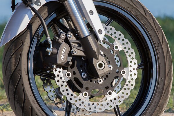 A váz és a blokk nem változott, de az idomokkal együtt lapátra tették a régi futóművet és féket is – az új Showa gátló egyik szárán a csillapítás, a másikon a rugózás állítható. A fék- és a kuplungkar is személyre szabható – ezt érdemes meglépni, egyből jó helyre kerülnek a fogáspontok, ha nem csak a köröm hegyével érem el. Végre a szélvédő is állítható, legalábbis magasságában, és ahhoz is le kell szállni a motorról, hogy a két csavart meg tudjuk lazítani. Jobban értékelném, ha mondjuk menet közben is lehetne hangolni, én például lényegesen többször nyúlnék hozzá, mint a futómű beállításaihoz.