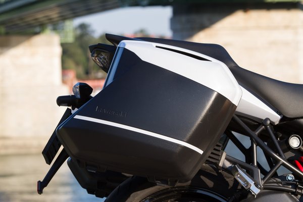 A jó ízlés jegyében a gyári oldaldobozok végre úgy néznek ki, ahogyan egy gyári szettnek kell. Az előző szériánál ugye a Givi rendszerét matricázták át, szó szerint, ennél viszont már a felfogató konzol maga az utaskapaszkodó, így a kofferek szépen belesimulnak a dizájnba, nem kellemetlenül széles a motor, valamint doboztalanul sem néz ki hülyén.
