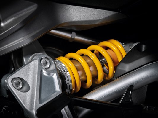 A térhálós acélcsőváz azonban megmaradt. Előre 50 milliméteres fejreállított villát építettek be, a hátsó rugózás is állítható. Ami a rugóutat illeti, elöl 120, hátul 110 milliméterről beszélhetünk. A fékrendszer Brembo Monobloc, elöl két 320 mm-es tárcsával, négydugattyús nyergekkel, hátul pedig egy darab 265-ös tárcsával, kétdugattyús nyereggel. A Bosch kanyarodást is figyelő blokkolásgátlója alapfelszereltség.