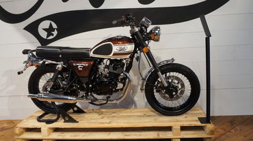 A 125 köbcentis, karbis, léghűtéses SOHC motor elég hitelesen retró, ahogyan az elöl tárcsa-hátul dob fékrendszer is utoljára a hetvenes években számított előremutatónak - ebben az esetben ez egyébként nem annyira súlyos hiba, hiszen így adja ki a stílust. A 11,5 lóerő és a 9,5 Nm amúgy sem egy kihegyezett motor paraméterei.
