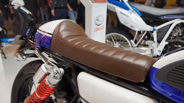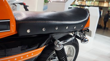 A fordított teleszkópvilla viszont egyfelől üvöltően gagyi, másrészt nem is illik a motorhoz - a narancs tank és annak inverzére fényezett ülés alatti idom legalább jópofa, ahogyan a szegecselt szélű ülés is elmegy, így már csak a márkajelzést és a csillagokat kell róla eltüntetni.