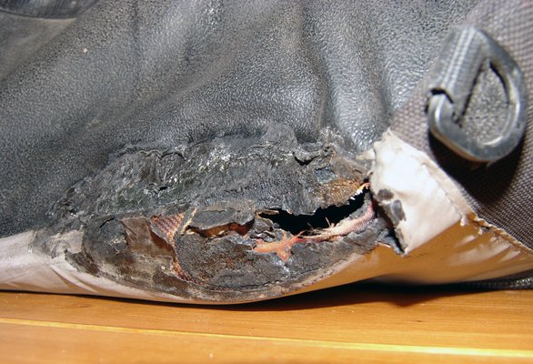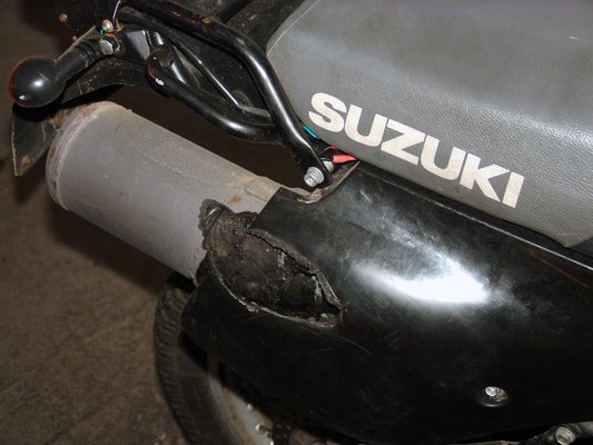 Ugyanis a Csótányon a kipufogó felőli rugalmas műanyag elemen belül nincs hőpajzs, egyszerűen csak egy bütyök tartja távol a dobtól - a feszesen felkötött táskák viszont keményen rányomták. Szerencsére harminc kilométer múlva megálltam tankolni, és kiszúrtam a bajt - akkor még csak egy húszforintosnyi kenődés volt a dobon, úgyhogy újságpapírból rögtönöztem egy távtartót, ami ki is tartott a bő 250 kilométeres távon. Mentem főúton, néhol levágtattam földutakra, élveztem a túrát, de nyugtalanított a jelenség.