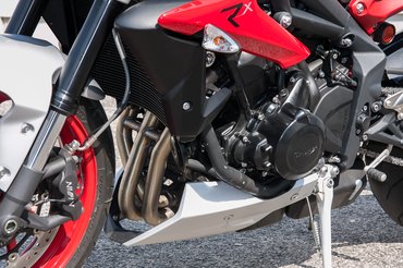 A Street Triple lelke, a háromhengeres, 12 szelepes, folyadékhűtéses, 675 köbcentis blokk, akárcsak a faridom, szintén a Daytona sportmotorból származik, igaz, itt visszafojtották 107 lóerőre. Nem kevés az, amikor csak 163 kilót (menetkészen 187) kell mozgatnia, s pláne nem kevés úgy, hogy a kissé visszafogottabb motornak emberbarátabb lett a nyomatéki karakterisztikája. Magyarul: lent húzod, indul, középen húzod, lódul, fent tovább csavarod, ordító vágtázásba kezd, max. a hipertérugrás marad el, amit a Daytona a 128 lóerejével művel.