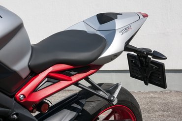 Ez itt, a teszten viszont egy újabb, modernebb Street Triple, ráadásul a spéci R-kivitel, full állítható futóművel, gyorsváltóval (erről többet később), sőt, így az X taggal megtoldva (azaz RX) már a Daytona faridomát és teljes hátsó vázrészét, ezért egyszemélyesnek tűnő ülését is hordja. Kapjatok el, ha esetleg elszédülök.