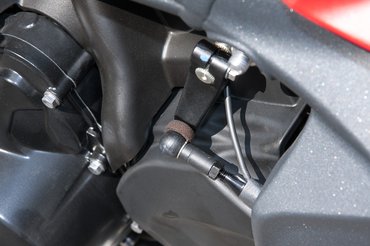 Alig három éjszakát lakott nálam, ezért az RX-speckós, csillapításra és előfeszítésre full-full állítható KYB-gátlós futóművet (ami az alapváltozathoz képest itt eleve kissé az orra felé dönti a motort, s ezzel idegesebbé is teszi kicsit az össz-geometriát), a programozható váltásjelzőket, köridős stoppert és az internetről vezérelhető, grillezős mikrosütőt nem volt túlzottan időm kipróbálni, ráadásul ez az RX-kivitel kvázi-együléses, tehát a hátsó puncipárna helyén csak egy sima műanyag idomja van, jelzésértékű gumidarabbal a közepén. Ez csak a rendőrnek kell, ha a forgalmit egybe akarja vetni a motorral, s rájön a számolhatnék: egy... kettő... rendben, megvan.