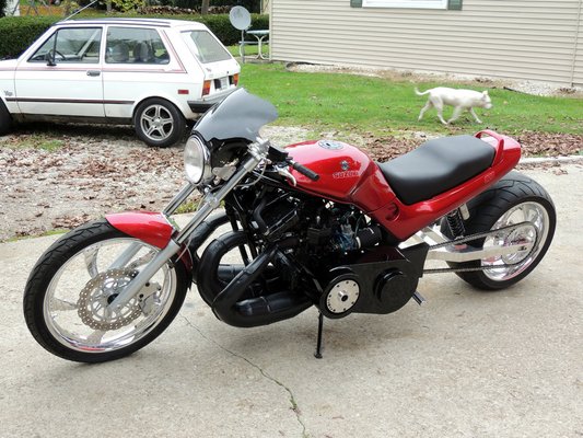 A furcsa nász másik fele a mi éghajlatunkon viszont ritka motyó: a blokk egy Arctic Cat ThunderCat 900 hómobil kétütemű, soros háromhengeres, CVT váltós blokkja. 180 lóerős, az építő szerint tíz másodperc alatt tudja a negyed mérföldet, ami körülbelül a Hayabusa szintje.