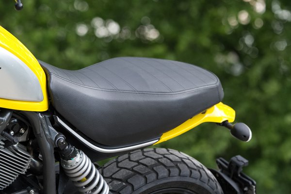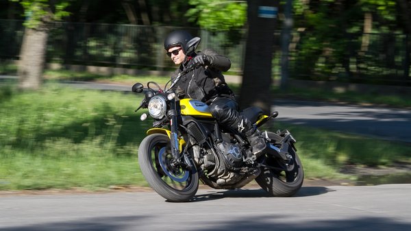 Helyet foglalva azonnal az irtózatosan széles, magas, és a pilótához közel nyúló kormány tűnik szembe. Micsoda vitorlarúd – gondoltam elsőre. A második meglepő érzés, mennyire alacsony az ülés egy mai terepmotorhoz viszonyítva. Erről már a fejlesztés közben is beszélt a Ducati, mert olyan motort akartak, amivel kezdők és törékeny nők is boldogulnak. Összességében kimondottan kicsi motornak érezzük a Scramblert, és ahogy elindulunk vele, gyorsan mosoly ül ki az arcunkra. A széles kormány nem csak laza testhelyzetet eredményez, de rendkívül kezessé is teszi a Ducatit – még soha nem volt ilyen együttműködő kéthengeresük. Nem kell félni, nem bicsaklik be, borotvaélesen rátalál az ember minden ívre.