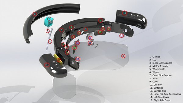Ennek lényege, hogy mint egy napellenzőt, fel lehet pattintani a sisak plexije fölé, és a rajta lévő lapát végzi a víz lehúzását - illetve fel lehet tölteni 100 ml ablakmosóval, és akkor nem csak lehúzza, de le is tisztítja a plexit. Az áramellátásról apró lithium-ion akkumulátor gondoskodik, ami egy feltöltéssel két órányi működést tesz lehetővé.